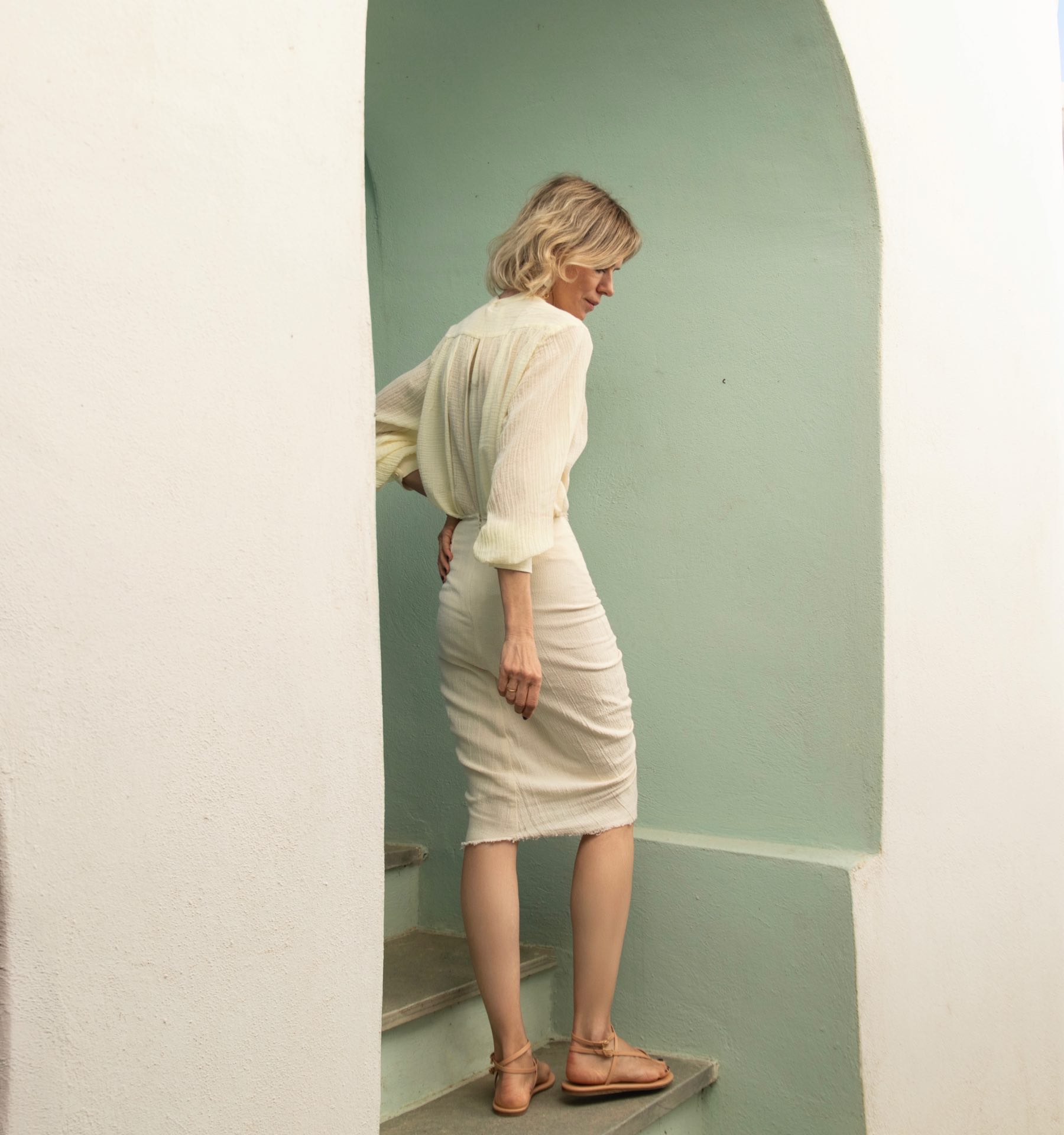Midi skirt with a softly gathered front that creates a flattering, slightly sculpted shape. Designed with a fitted silhouette and a comfortable mid-length that falls just below the knee. Finished with a hidden back zip closure. Made from 100% lightweight linen cotton. Fits true to size.