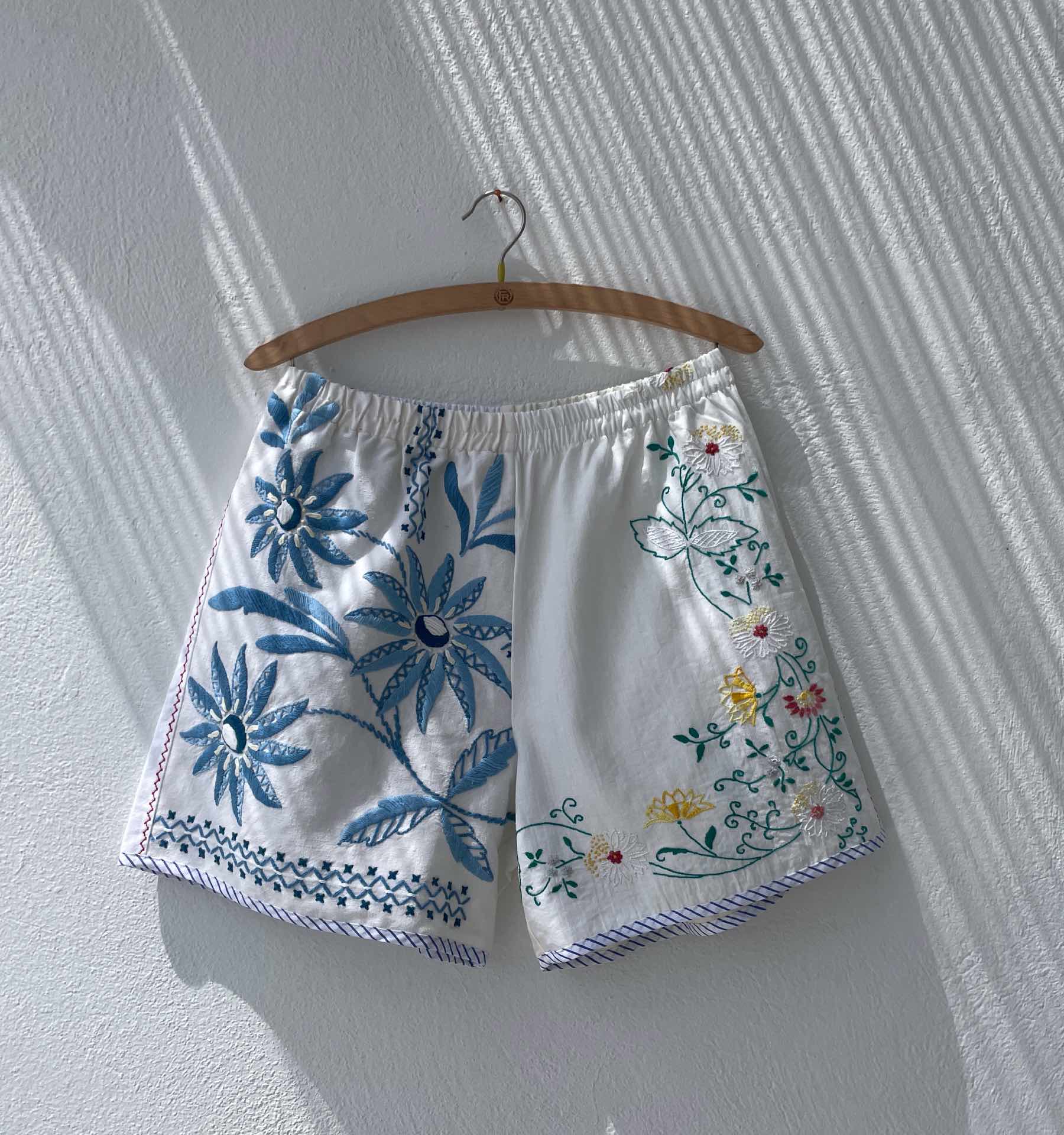 White shorts made of cotton, decorations sewn in relief on the front, elastic waist, soft fit, straight hem.