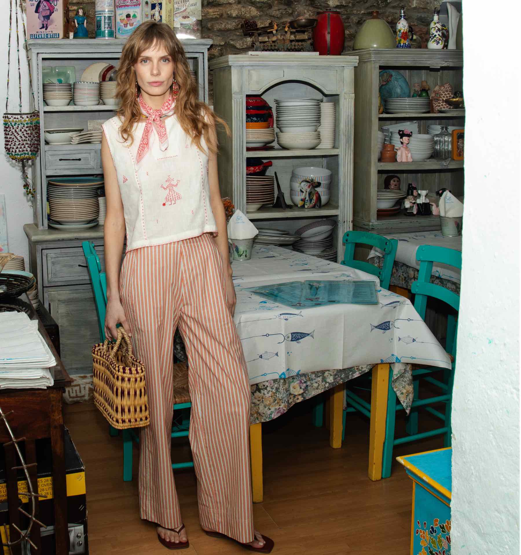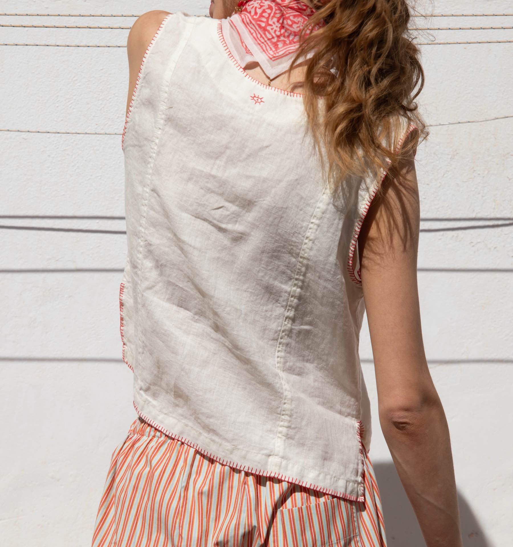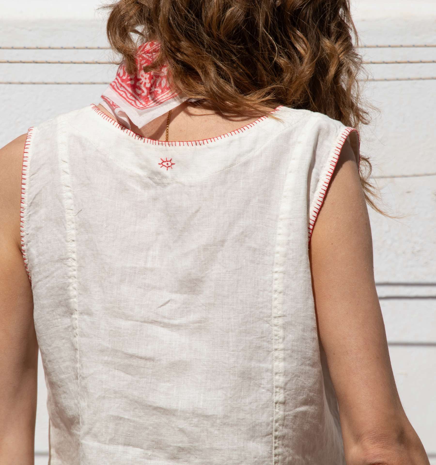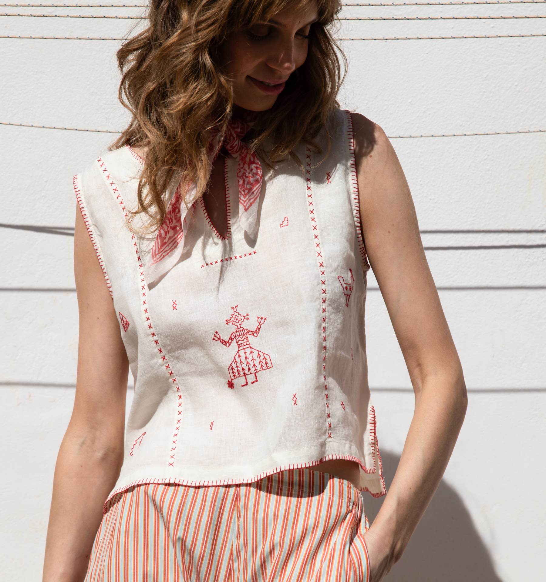 This sleeveless linen top is a celebration of craftsmanship, adorned with intricate hand embroidery. Each piece is uniquely made, carrying the beauty of artisanal work. A timeless summer essential, designed to feel as light as it looks.