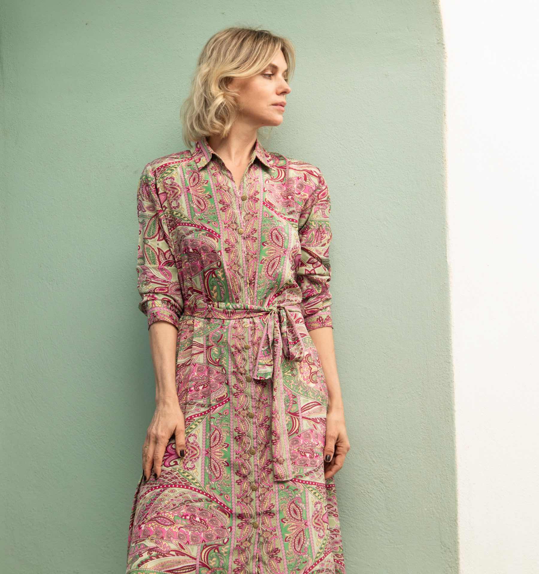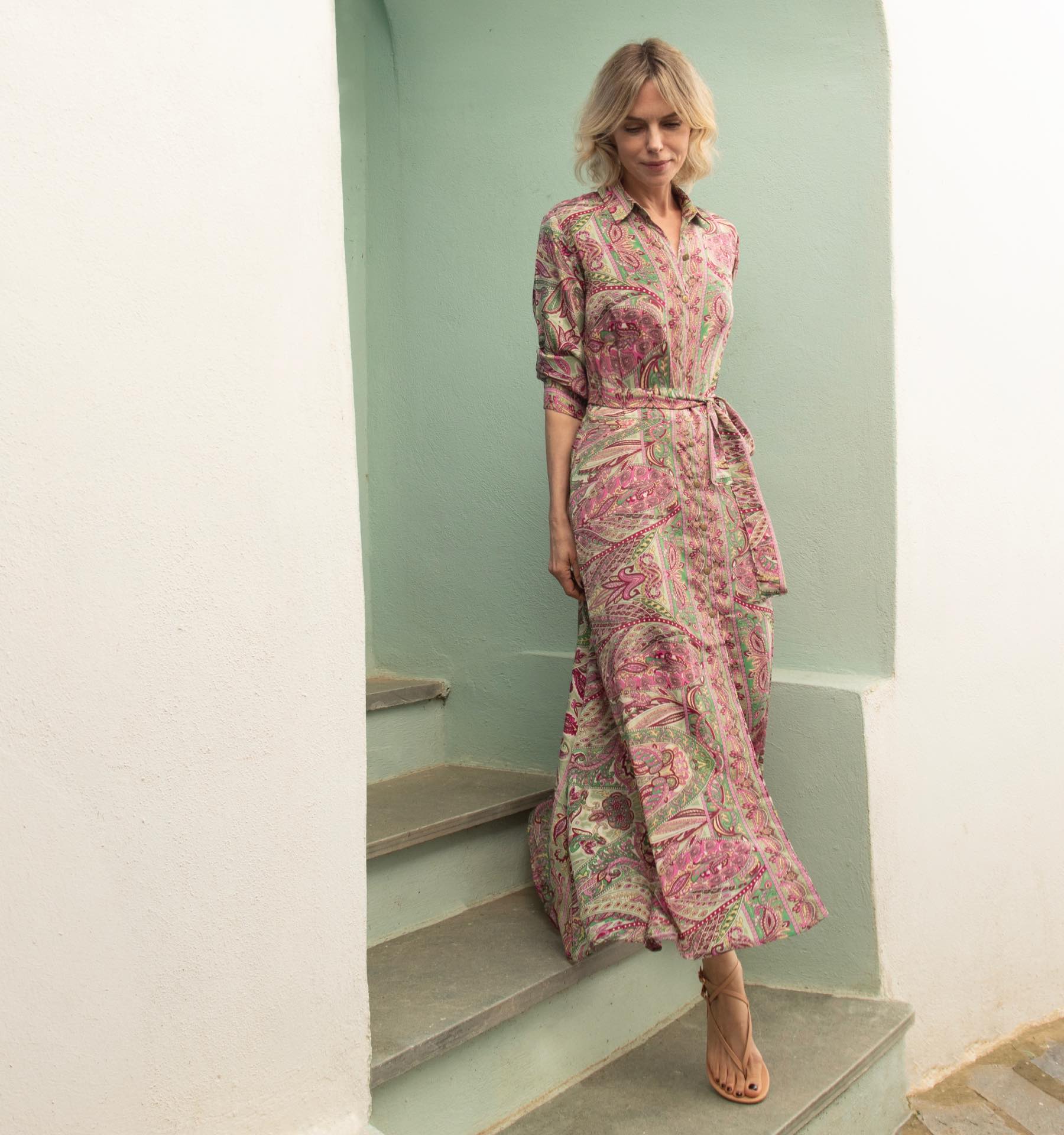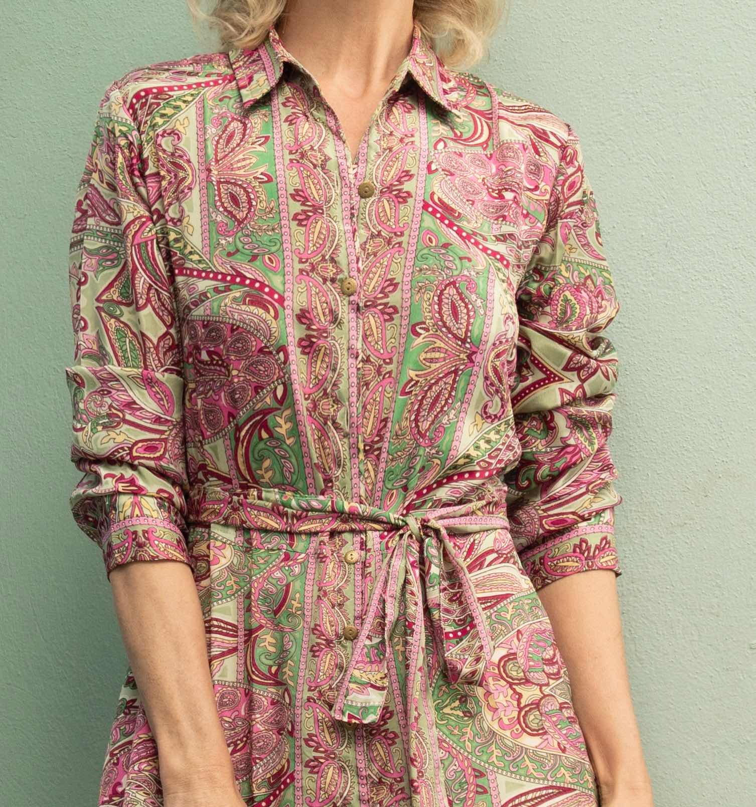 Our timeless shirt dress crafted from delicate sari silk. Lightweight, refined, and effortlessly elegant, with long sleeves, a button-down front, and waist belt. Designed for both elevated occasions and everyday ease.