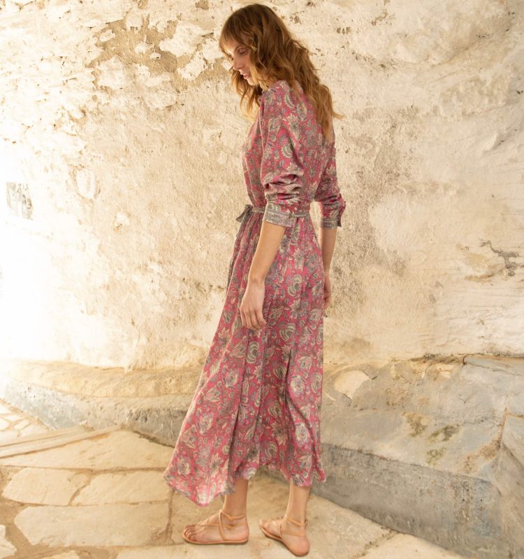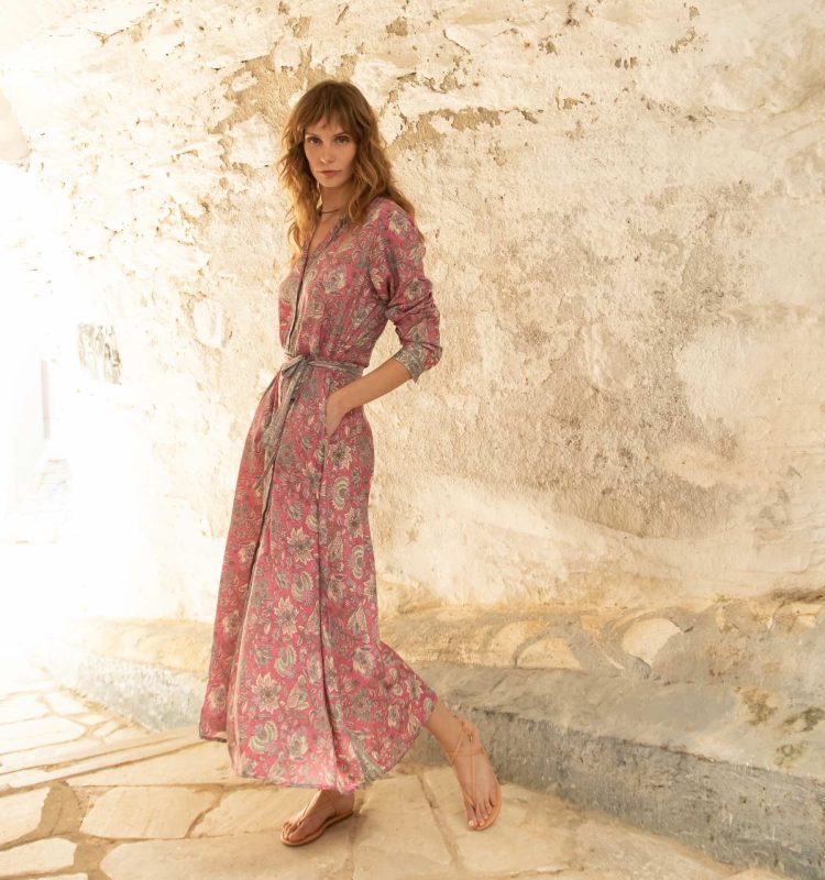 Our timeless shirt dress crafted from delicate sari silk. Lightweight, refined, and effortlessly elegant, with long sleeves, a button-down front, and waist belt. Designed for both elevated occasions and everyday ease.